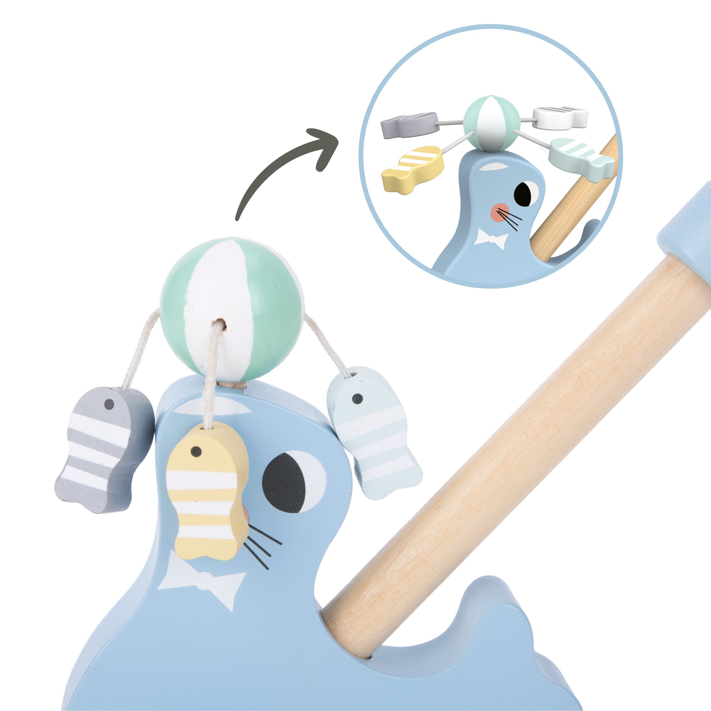 Foca adorabilă îl va face pe cel mic să se simtă mai încrezător pe măsură ce își perfecționează abilitățile de mers. Pur și simplu apucă bara atașată de ea pentru a oferi un tovarăș adorabil pentru plimbări nu doar prin casă, ci și afară. Prin împingerea focii, copilul mic poate urmări cum se mișcă mingea de pe botul ei. Datorită ei, primele plimbări se vor transforma într-o adevărată plăcere!
