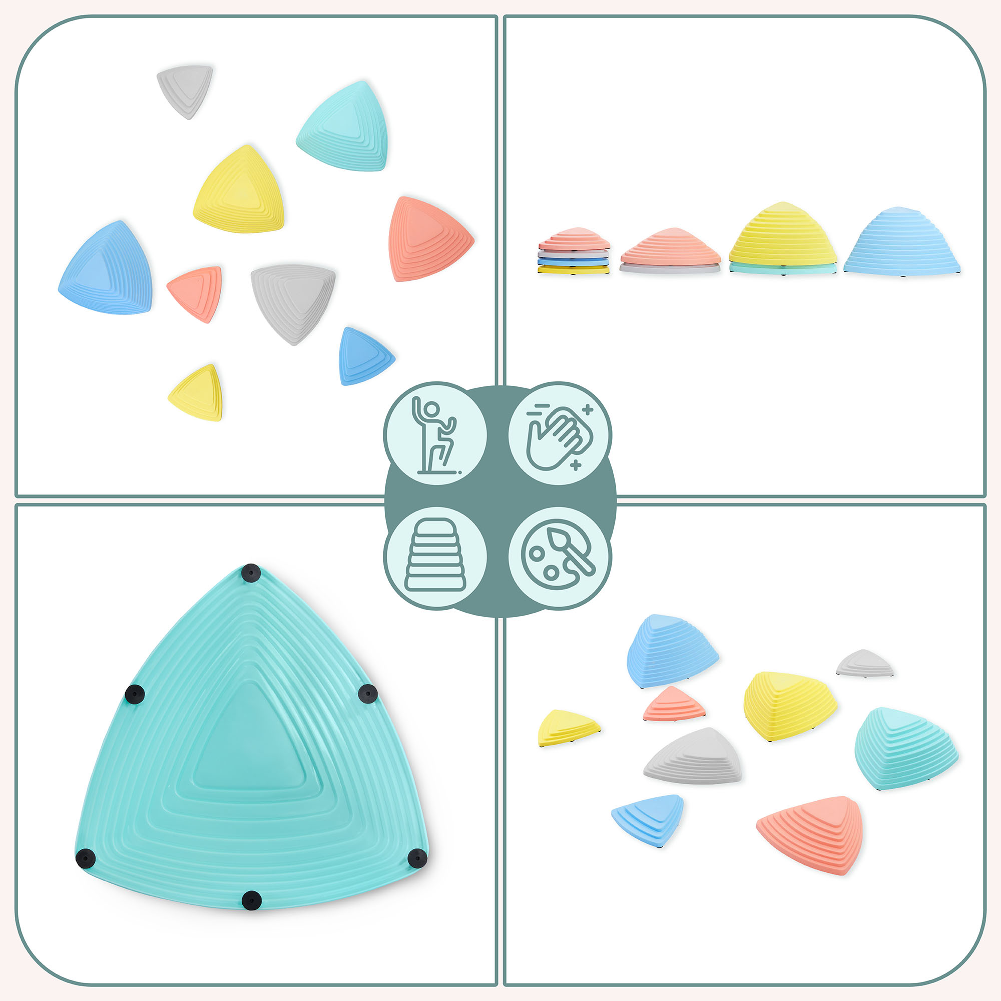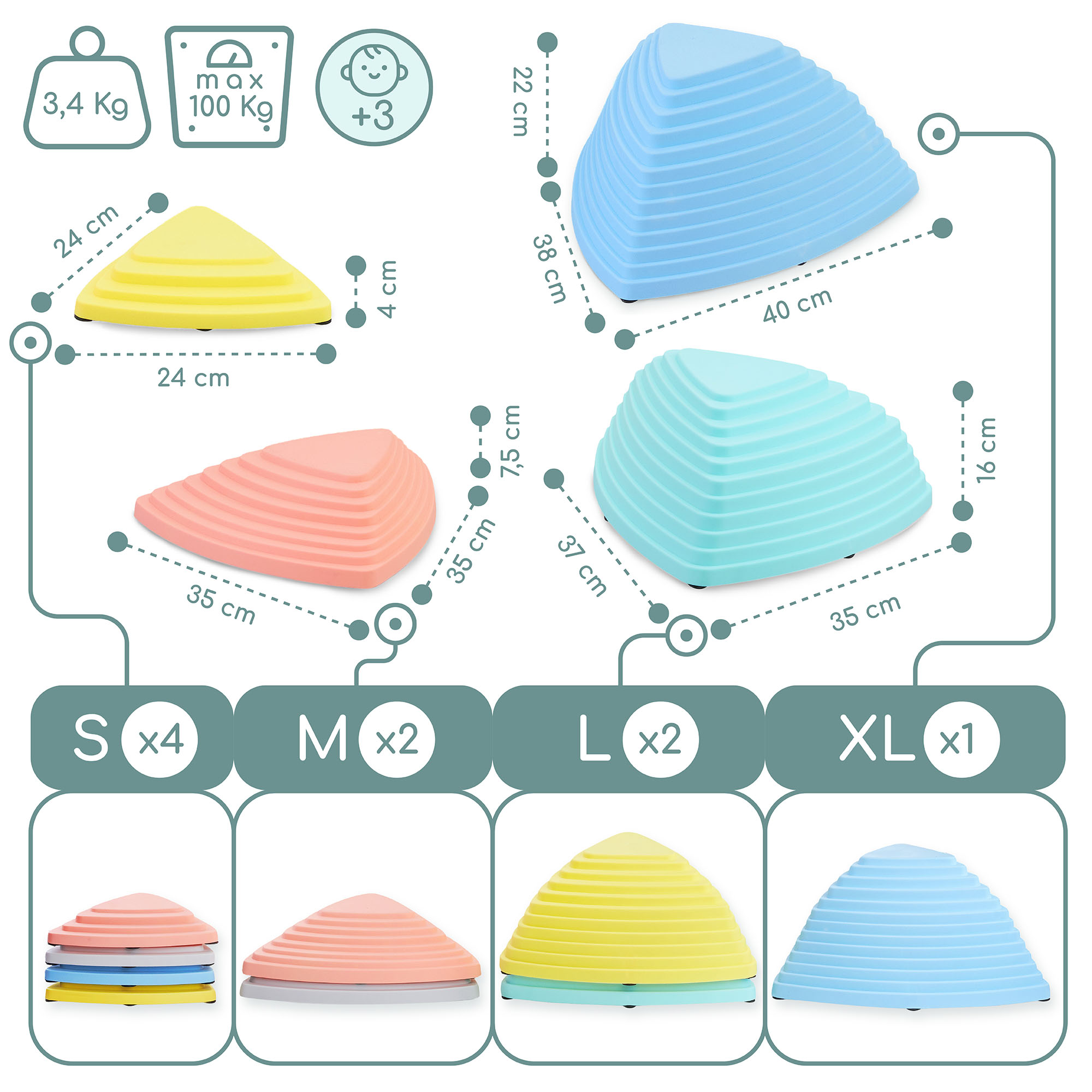 Setul de pietre de echilibrare conține 9 piese de diferite dimensiuni și culori. Pur și simplu așezați-le la o anumită distanță una de cealaltă pentru a-i oferi copilului dvs. mic o distracție captivantă. Echilibrarea pe o succesiune de pietre este un antrenament excelent pentru echilibru și exercită coordonarea motorie. Setul este o alegere excelentă nu numai pentru casă, ci și pentru camera copilului sau camera de reabilitare.
