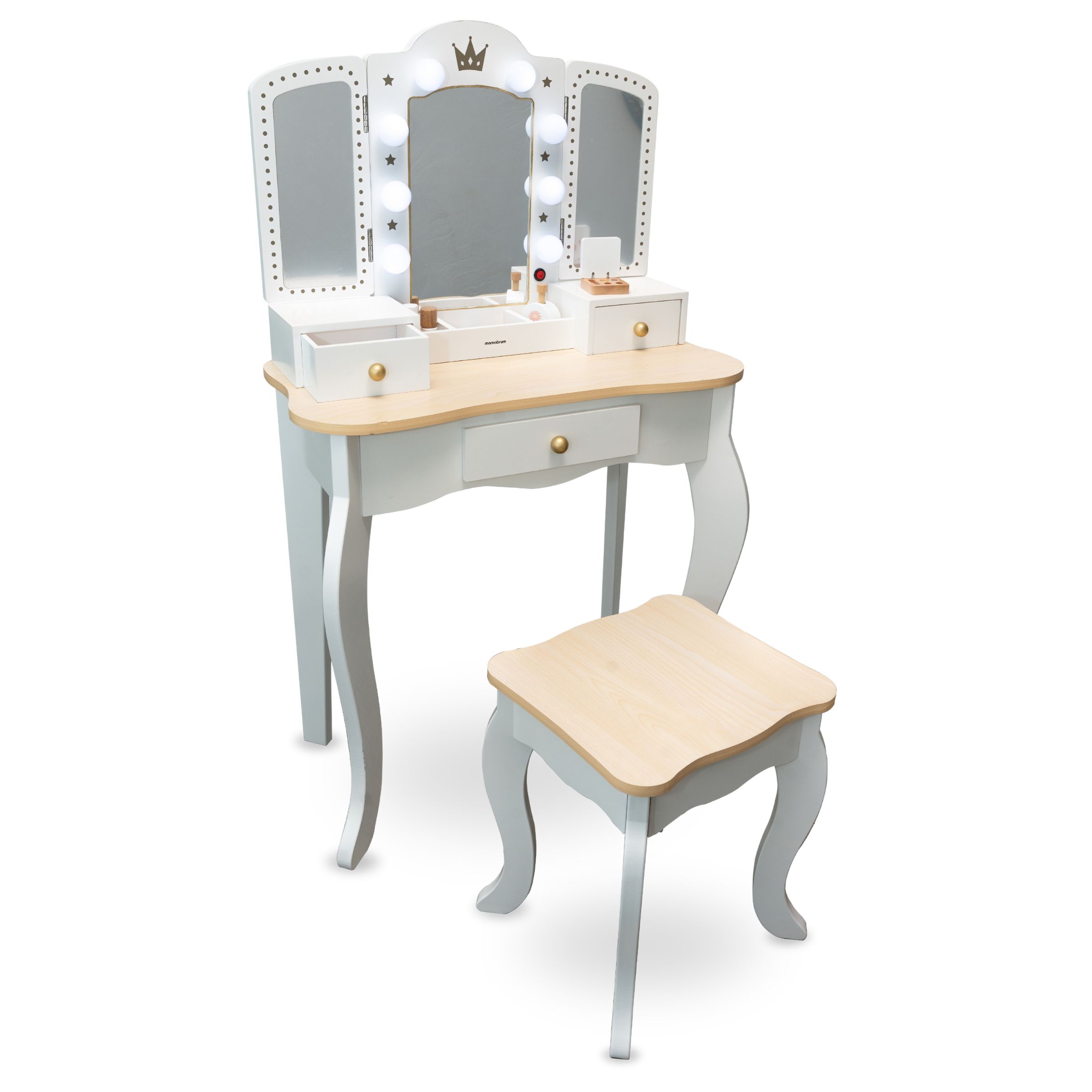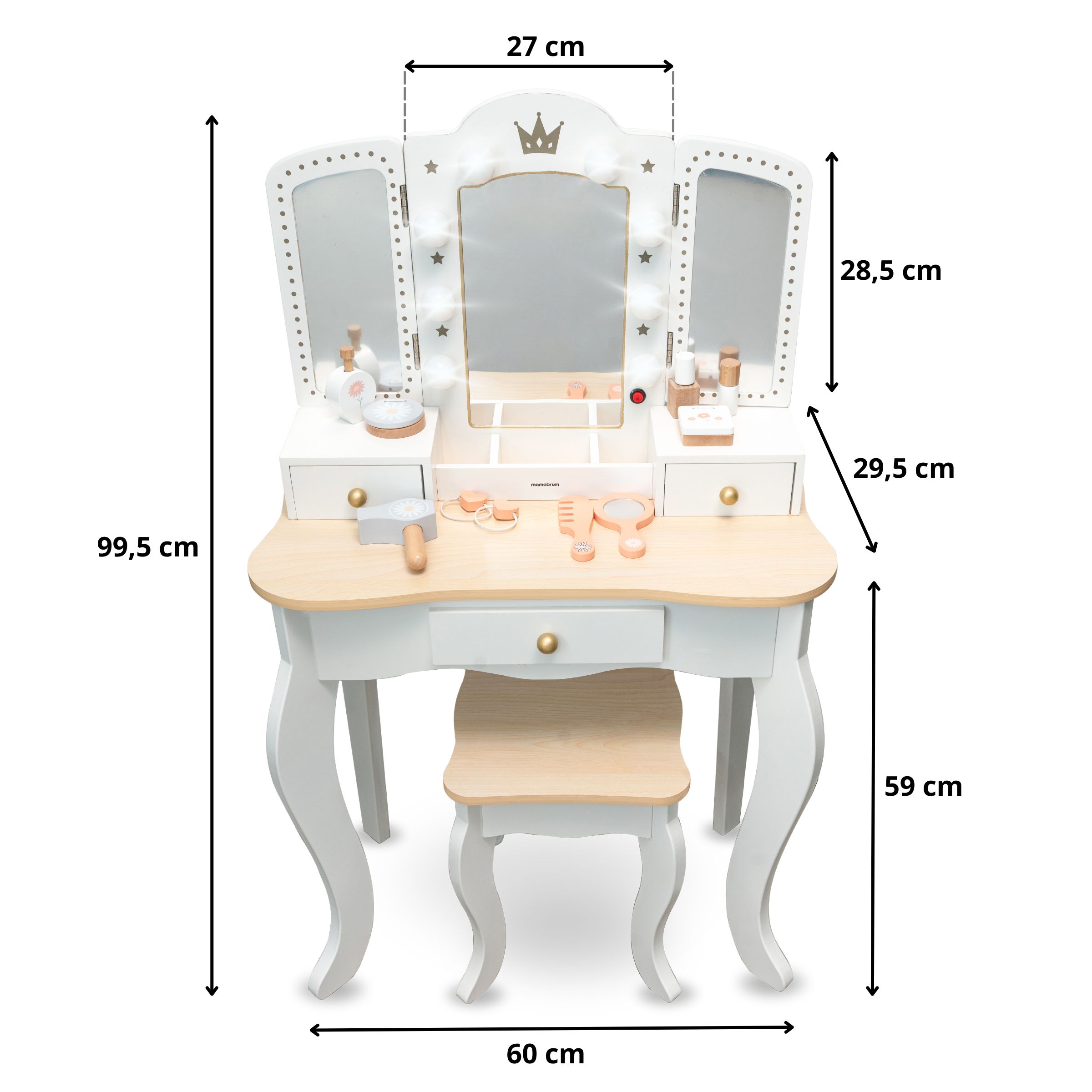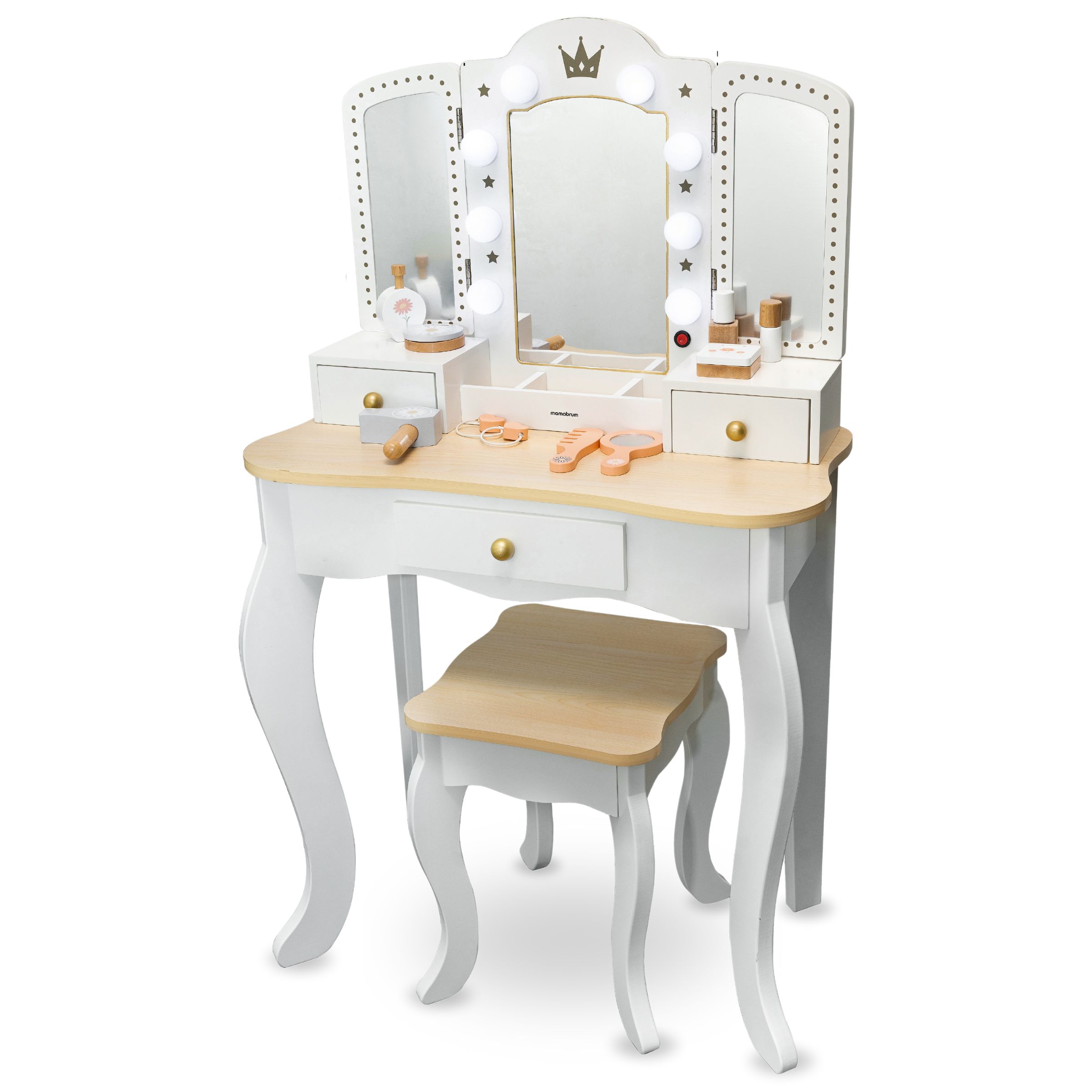 Iluminarea atmosferică și blândă este asigurată de 8 becuri LED. Oglinda poate fi îndepărtată, transformând măsuța de toaletă într-un mic birou. Pentru a vă vedea fața dintr-un unghi diferit, pur și simplu reglați oglinzile laterale. Măsuța de toaletă din lemn este o idee unică de cadou pentru micuțul dumneavoastră!