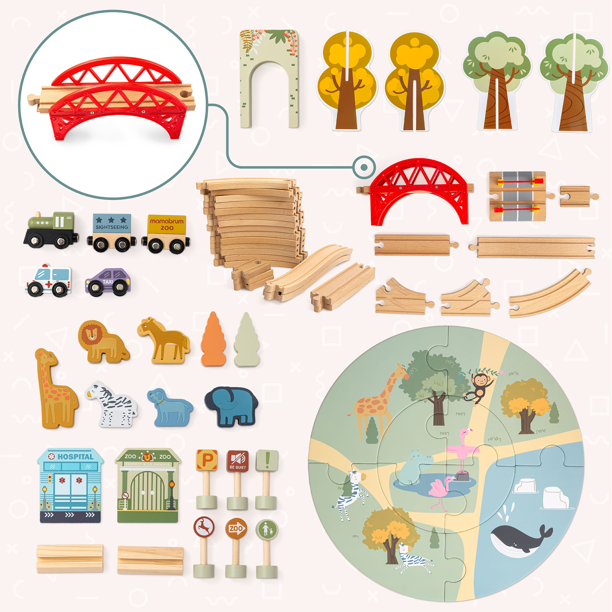 Trenuleț din lemn pentru grădina zoologică – puzzle, tren, șine, animale, pod, barieră