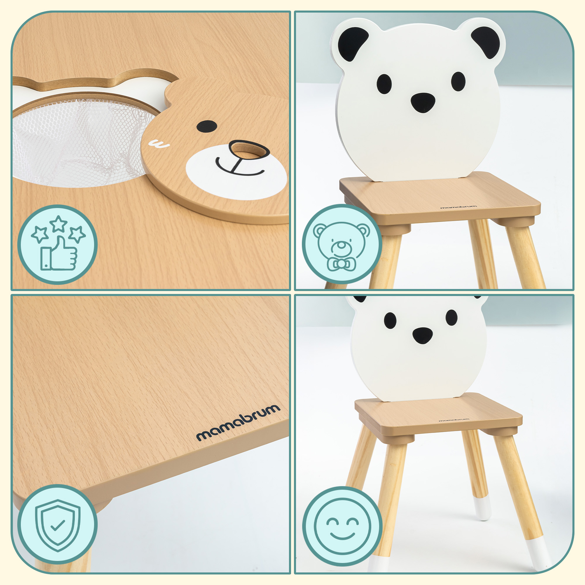 Setul nu este doar plăcut vizual, ci dezvoltă și independența copiilor. Masa cu spațiu de depozitare ajută la menținerea ordinii , în timp ce scaunele cu spătar în formă de ursuleț de pluș încurajează petrecerea timpului împreună la masă. Datorită înălțimii adecvate a șezutului (26,5 cm), mobilierul este confortabil și sigur pentru utilizatorii tineri.