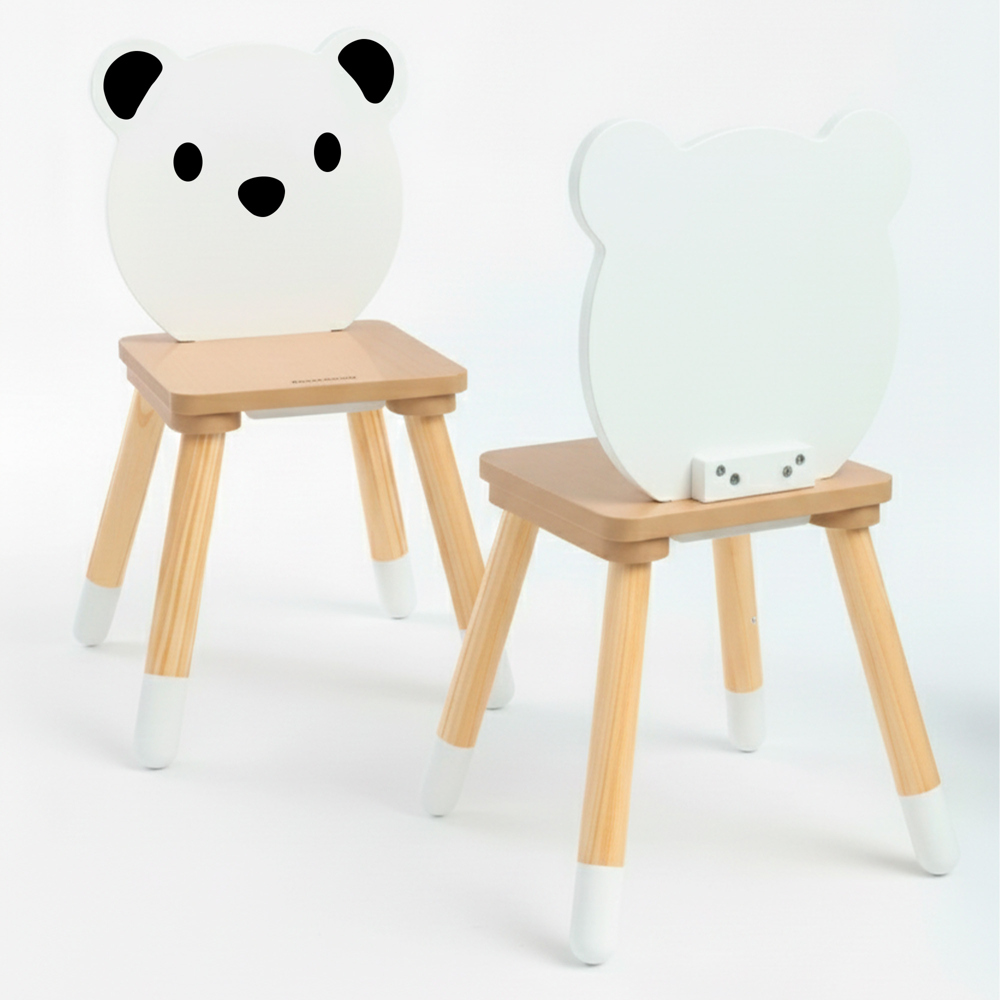 - Un design fermecător cu ursuleți de pluș - spătarele scaunelor au formă de fețe de ursuleți de pluș, iar blatul mesei are o imagine cu un ursuleț de pluș pe el.
