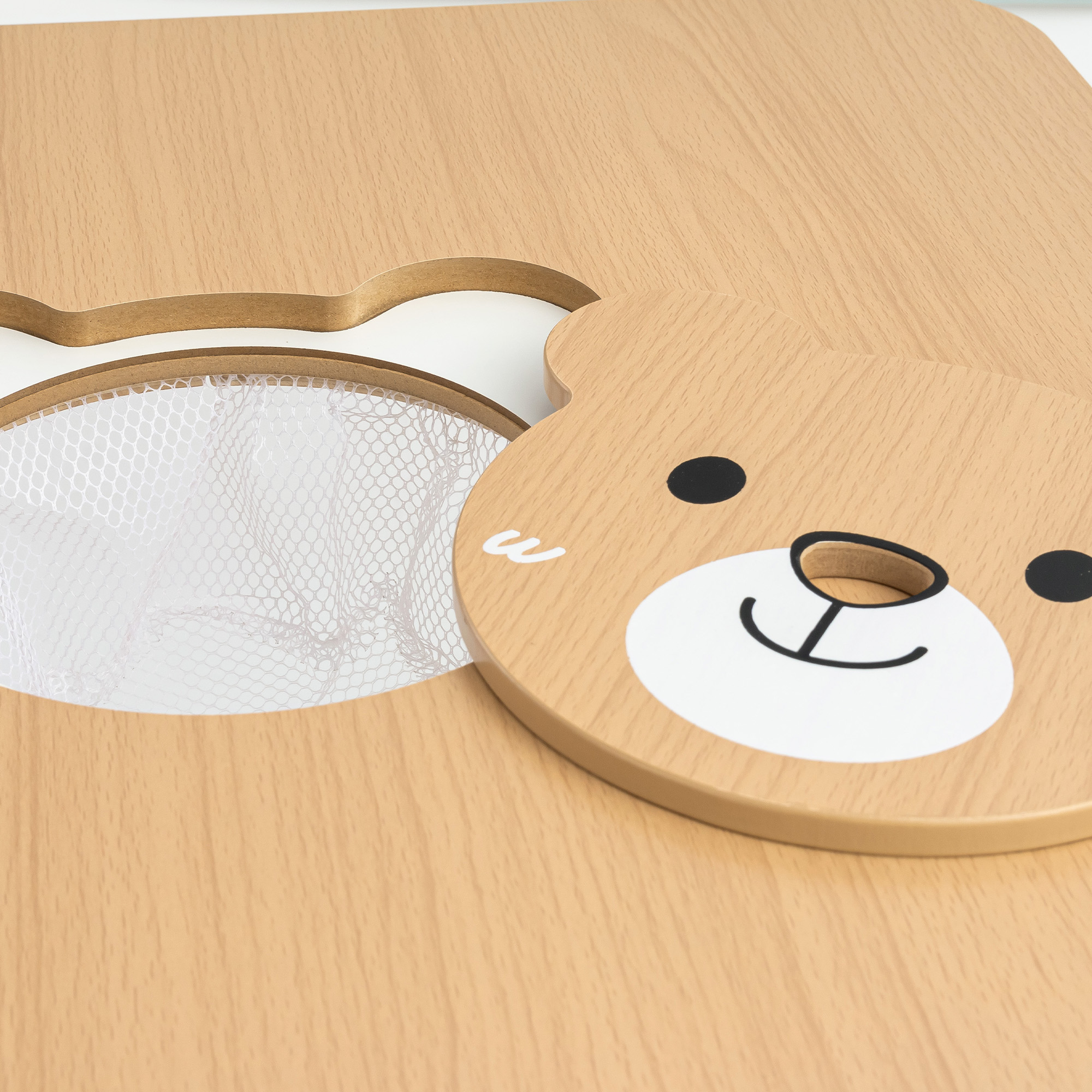 Compartimentul central de depozitare, realizat din plasă flexibilă, este un adevărat punct forte al acestei mese – ascuns ingenios sub blatul mesei , vă permite să depozitați rapid creioane colorate, blocuri sau jucării preferate, menținând în același timp blatul ordonat. Compartimentul are un capac practic, în formă de ursuleț de pluș, care, atunci când este închis, creează o suprafață perfect netedă . Copiii au acces facil la toate lucrurile esențiale fără a fi nevoiți să se ridice de la masă. Acest lucru nu este doar practic, ci și o încântare pentru cei mici – de fiecare dată când bagă mâna în „buzunarul secret” de sub blatul mesei, transformă o joacă obișnuită într-o aventură captivantă!