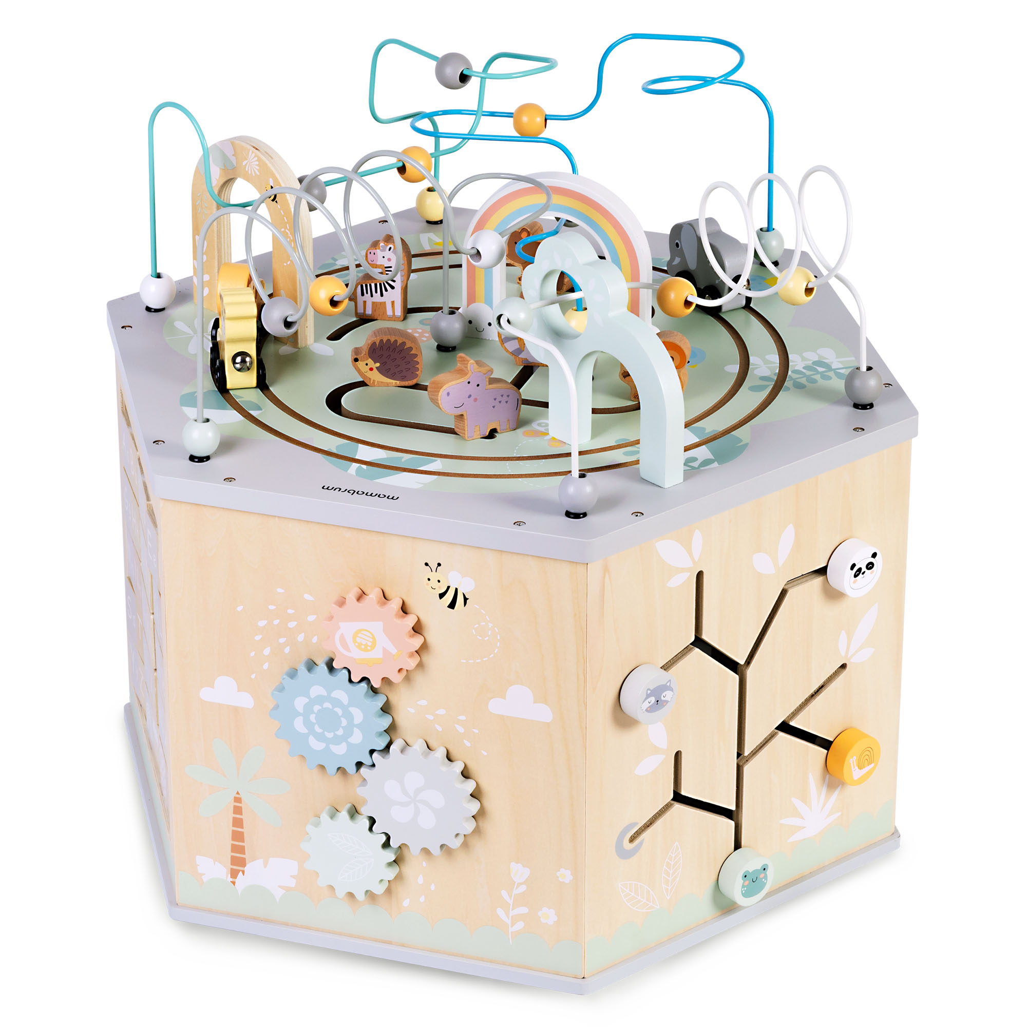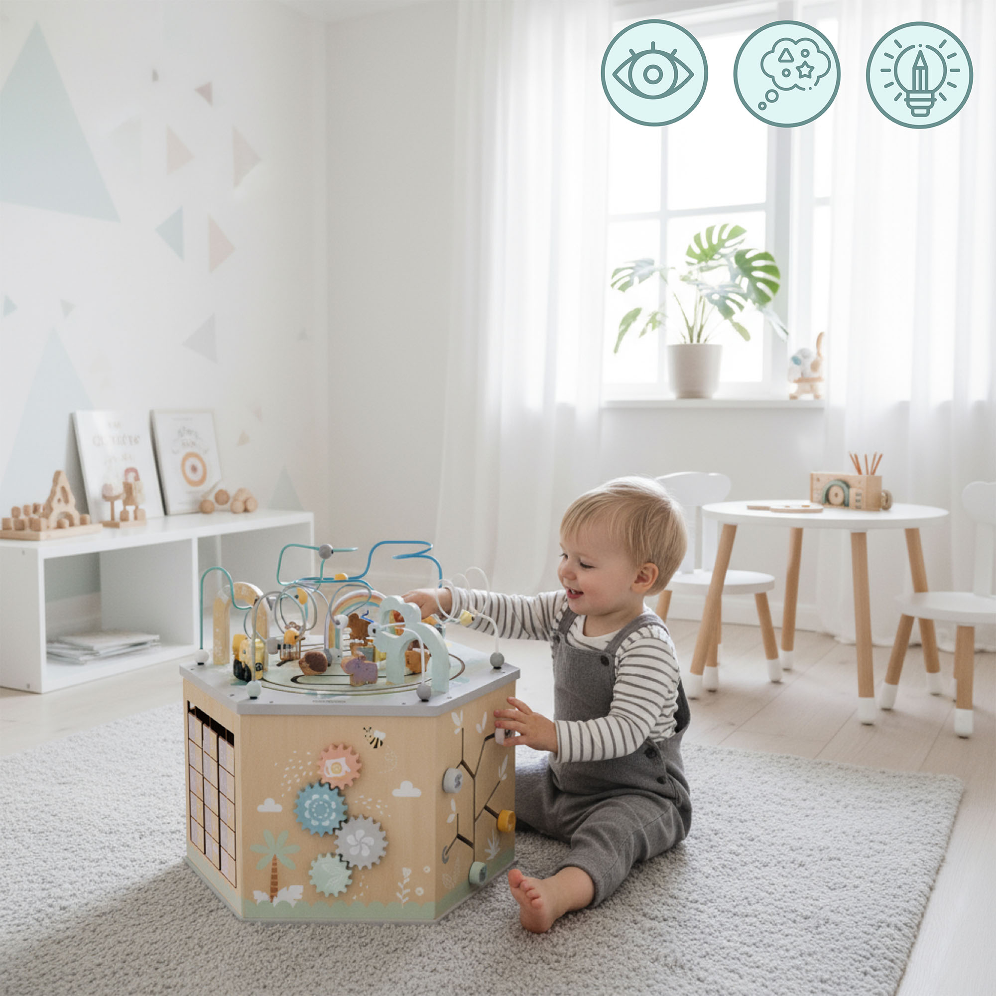 Acest cub educațional este un centru de dezvoltare – fiecare activitate susține diferite abilități la copii . Ceasul predă concepte timpurii despre timp, alfabetul și 26 de cuvinte în limba engleză dezvoltă limbajul, iar roțile dințate și plăcuțele cu animale stimulează curiozitatea și gândirea logică . Sortatorul de forme, labirinturile manipulative și buclele motorii dezvoltă dexteritatea manuală , răbdarea și coordonarea . Tunelurile colorate, figurinele și un trenuleț cu animale dezvoltă imaginația și creativitatea. Datorită acestei diversități, copiii învață și se joacă simultan, descoperind lumea pe mai multe niveluri.
