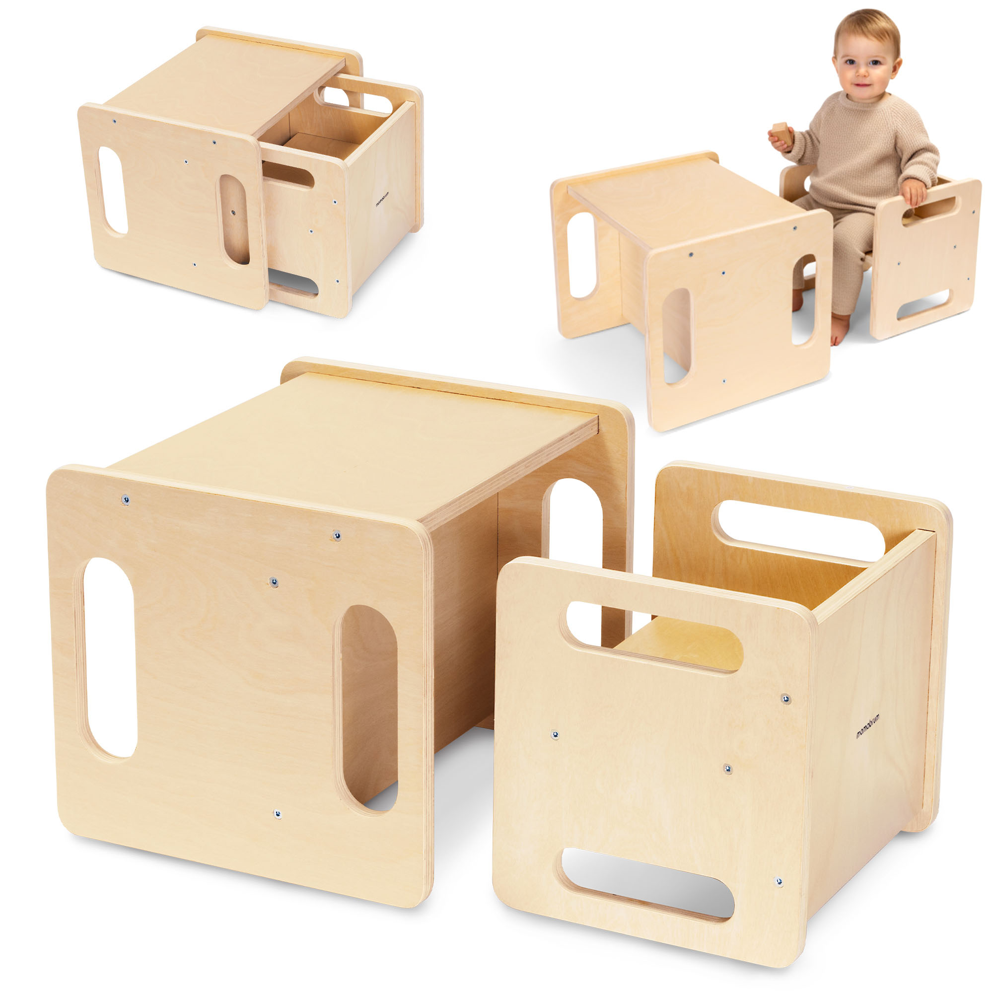 Masă și scaun din lemn cu funcție de platformă - un set Montessori multifuncțional pentru copii