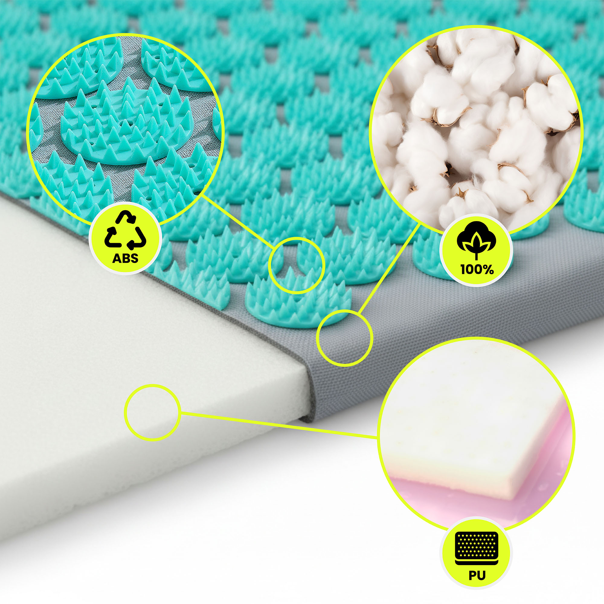 Fiecare element al setului este conceput având în vedere confortul și utilizarea zilnică. Husele pentru covoraș și pernă sunt fabricate din bumbac natural 100% , moale la atingere și oferă un contact plăcut cu pielea, în timp ce interiorul este umplut cu spumă flexibilă pentru un suport stabil . Vârfurile durabile din plastic au vârfuri rotunjite în siguranță , oferind o stimulare blândă, dar vizibilă. O husă de transport ușoară din nailon , rezistentă la abraziune, completează setul.
