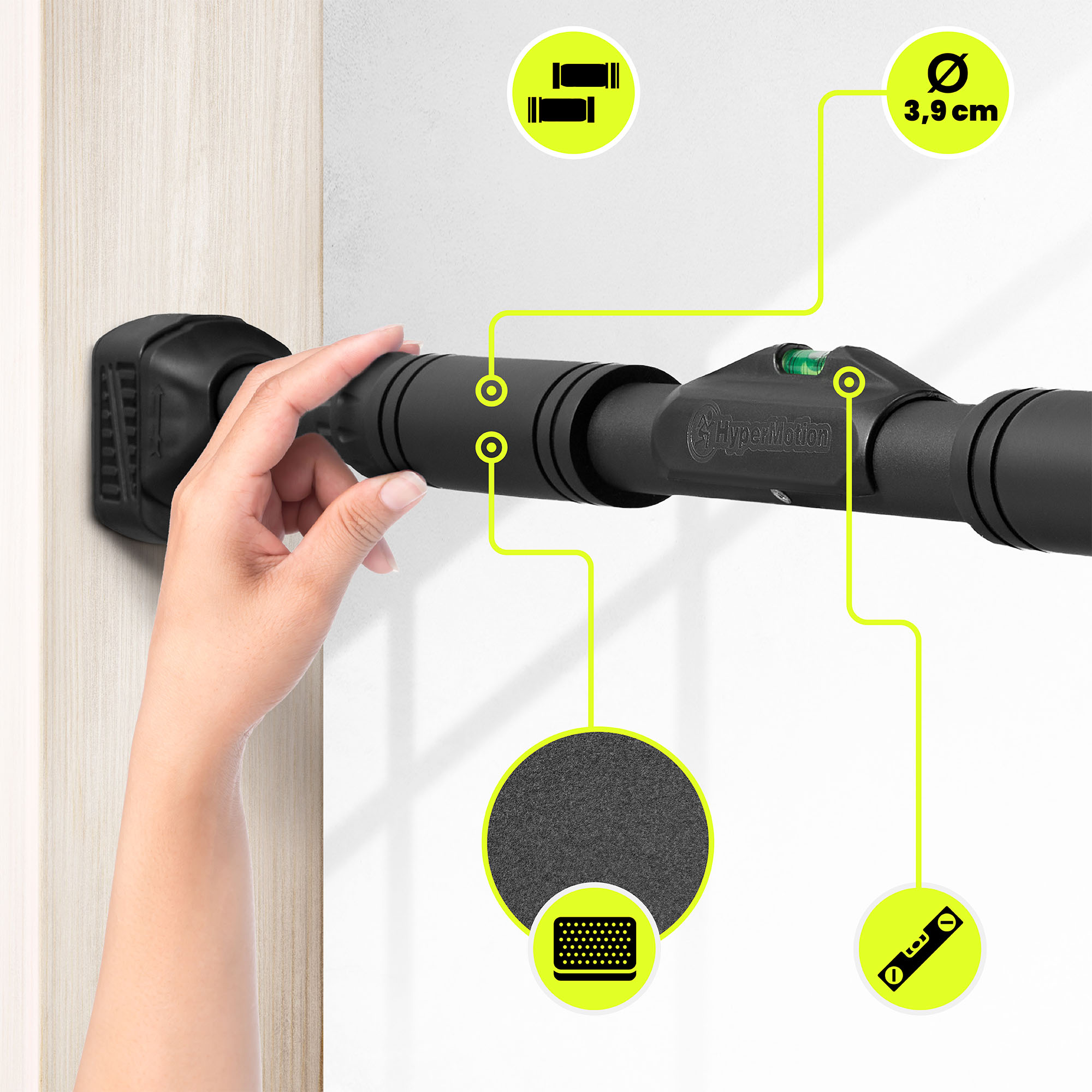 Sistemul de montare, bazat pe forța de expansiune, permite instalarea rapidă, stabilă și neinvazivă a barei între tocuri , fără a fi nevoie de găuri sau unelte suplimentare. Vârfurile cauciucate din material modern TPR (Thermo Plastic Rubber) protejează eficient suprafața tocului ușii de deteriorare și cresc aderența, asigurând o instalare sigură în timpul exercițiilor fizice. O nivelă încorporată facilitează poziționarea corectă a barei, ajutând la menținerea poziției corecte în timpul asamblării. Datorită designului intuitiv, instalarea durează doar câteva momente, iar o bară montată corect rămâne stabilă și gata de antrenament.