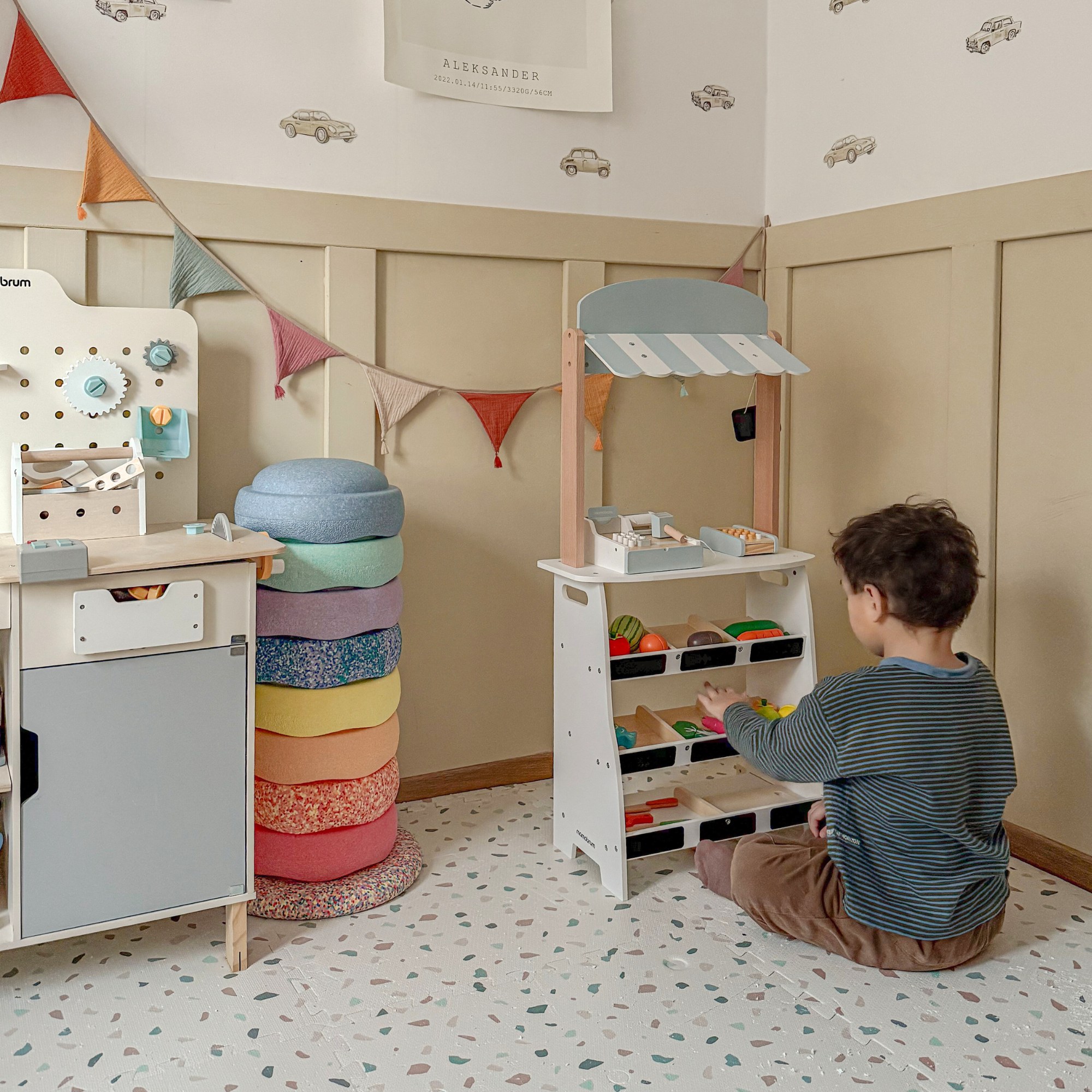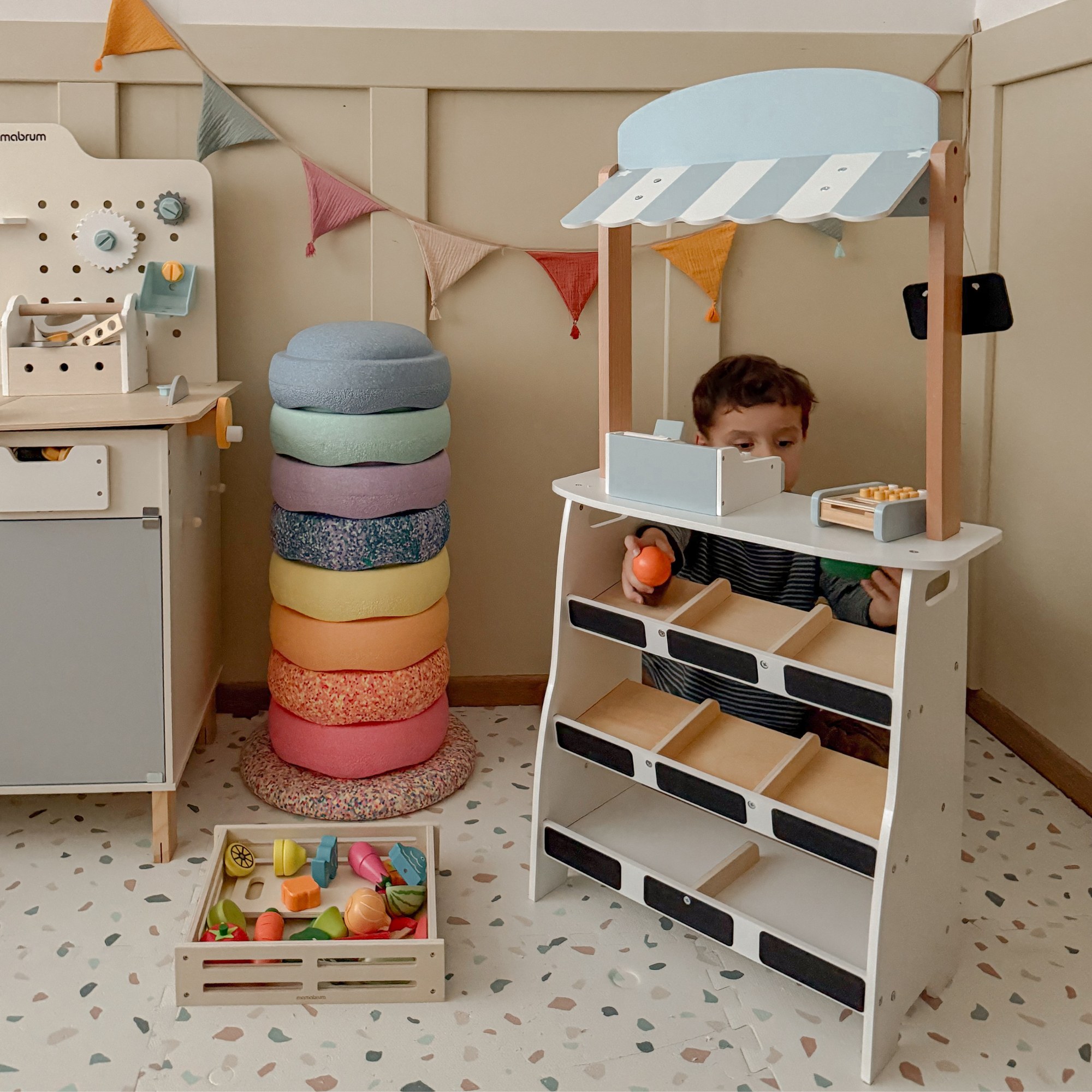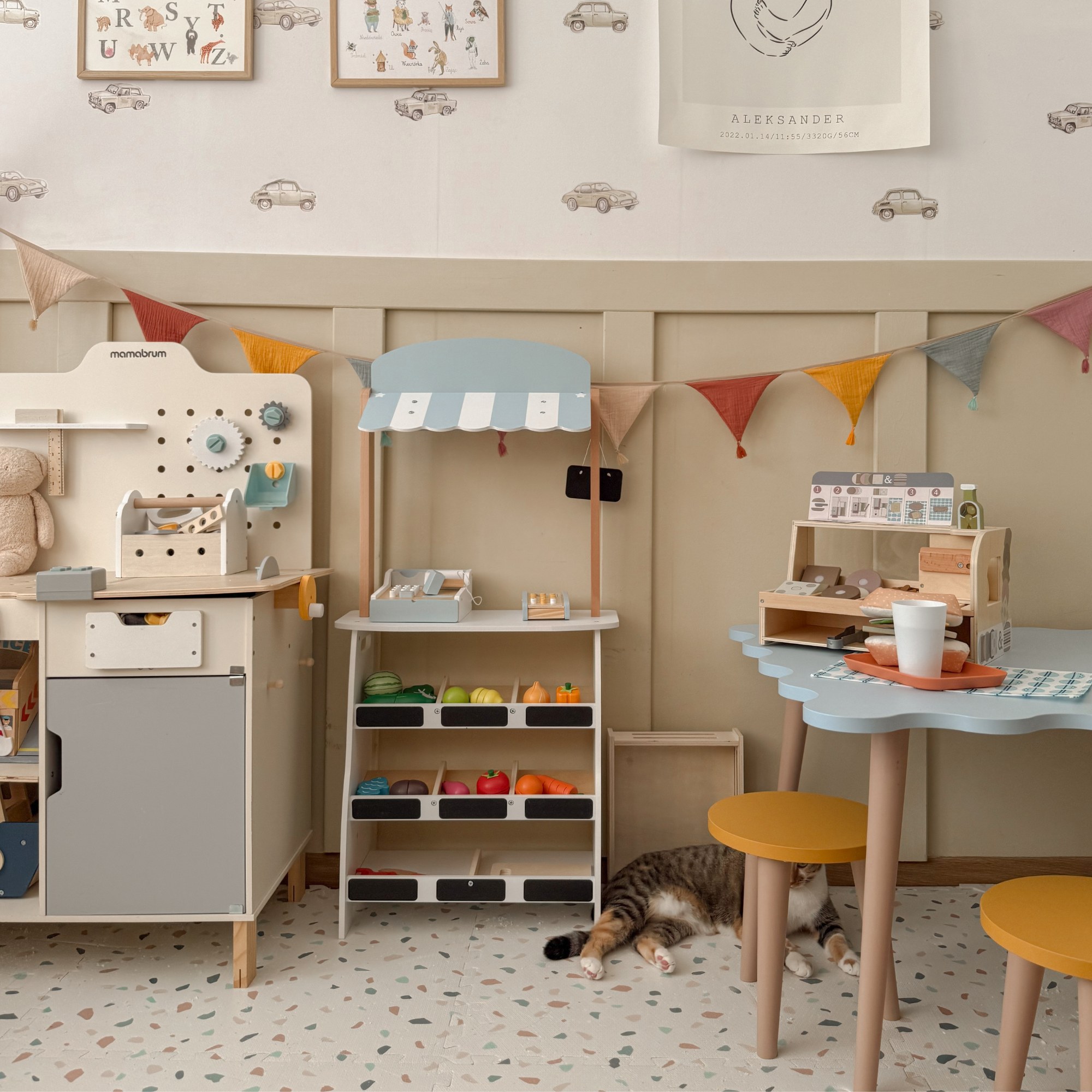 Produsele sunt identice cu cele reale, însă nu au margini ascuțiteMaterialul și dimensiunea accesoriilor au fost adaptate la nevoile copiilor mici, permițându-le să cunoască diferitele fructe și legume și funcțiile lor în deplină siguranță.