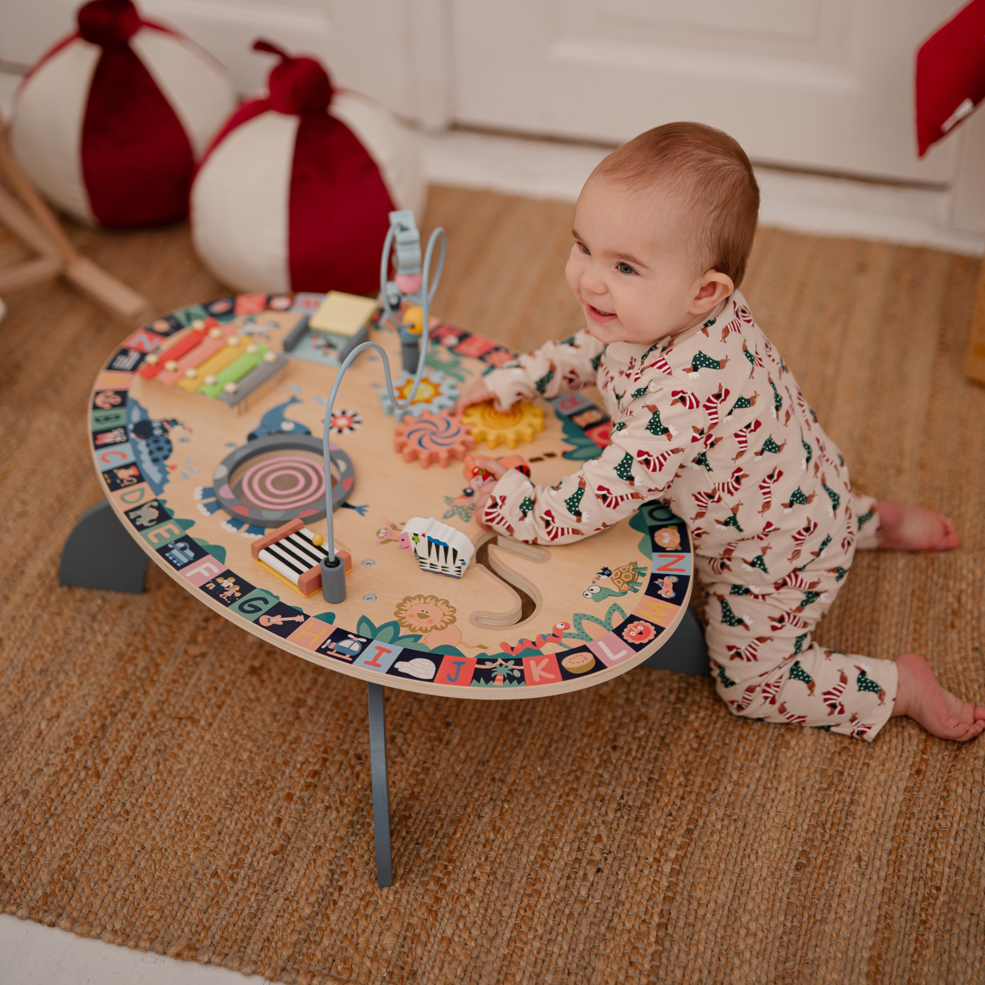 Masa include o mulțime de elemente de joacă educative, cum ar fi un labirint de mărgele, figurine de animale care se deplasează de-a lungul unui traseu stabilit, angrenaje în mișcare și o ușă "akuku"! Copiii pot explora funcțiile neobișnuite ale acestor jucării, ceea ce încurajează gândirea creativă și descoperirea de noi posibilități. Prin joc, copilul mic își îmbunătățește abilitățile motorii și cognitive. O astfel de jucărie minunat concepută nu numai că oferă un timp minunat, dar în același timp distracție și învățare ușoară!