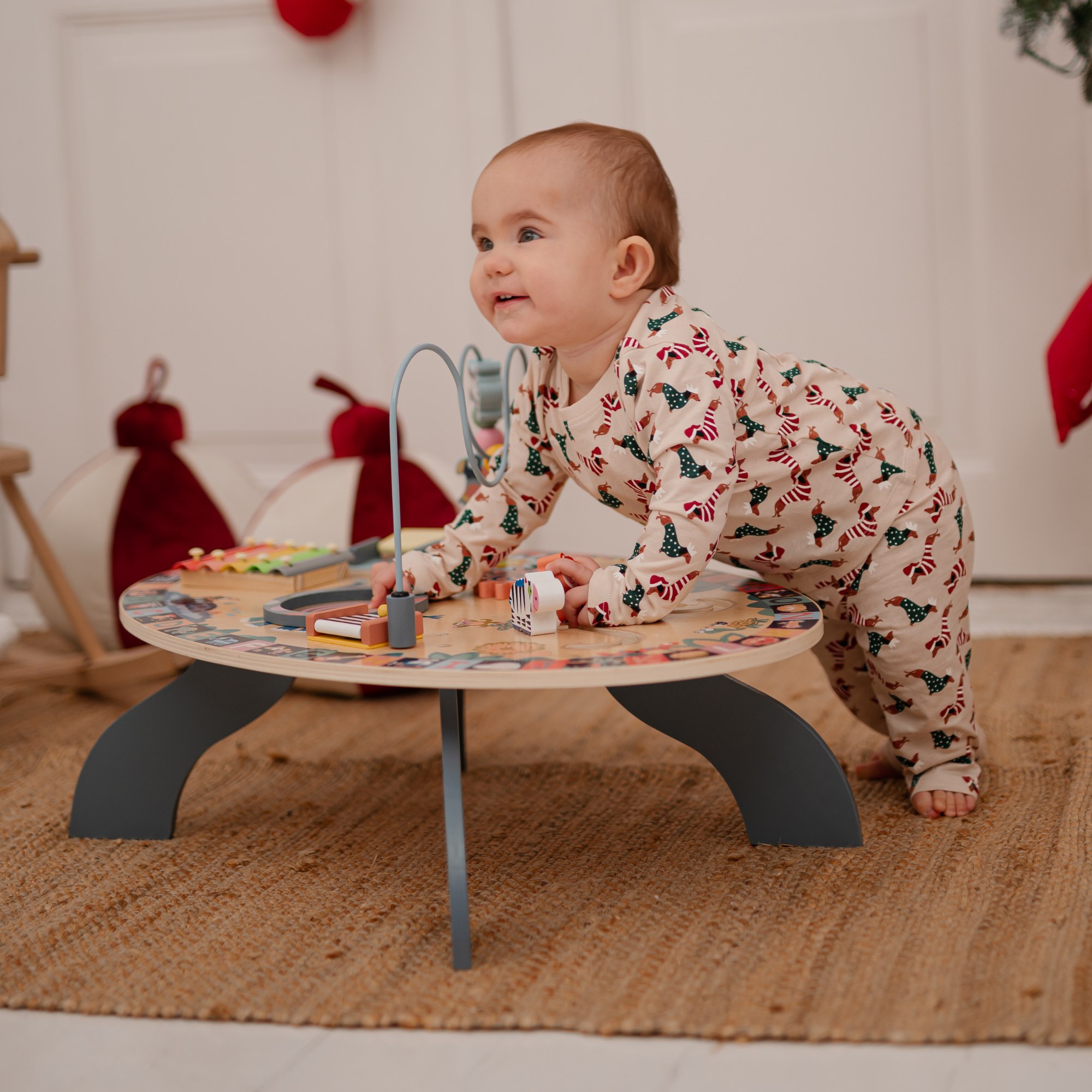 Masa este echipată cu un țambal, o tobă și o baghetă specială pentru joc. Copilul mic își poate crea propriile melodii și sunete ritmice, ceea ce îi va dezvolta interesul pentru muzică și îi va stimula abilitățile de ascultare!