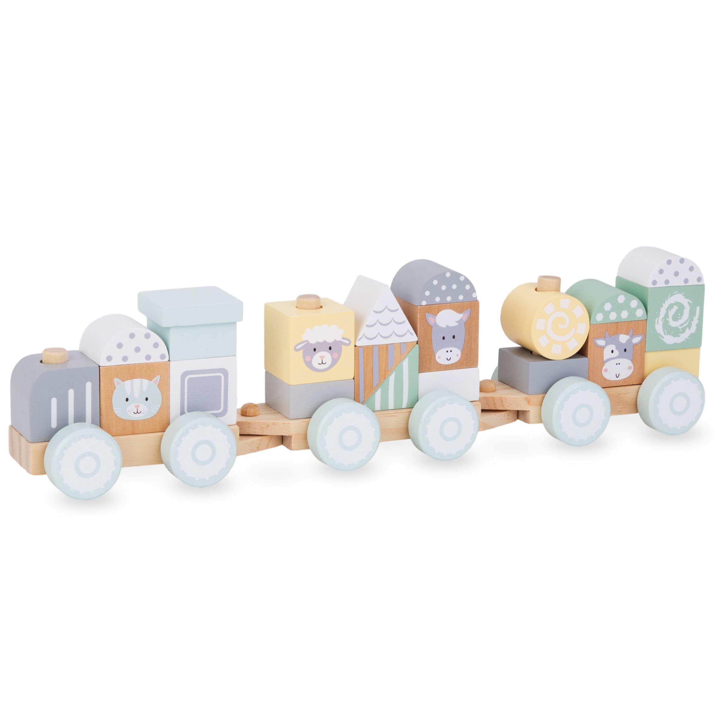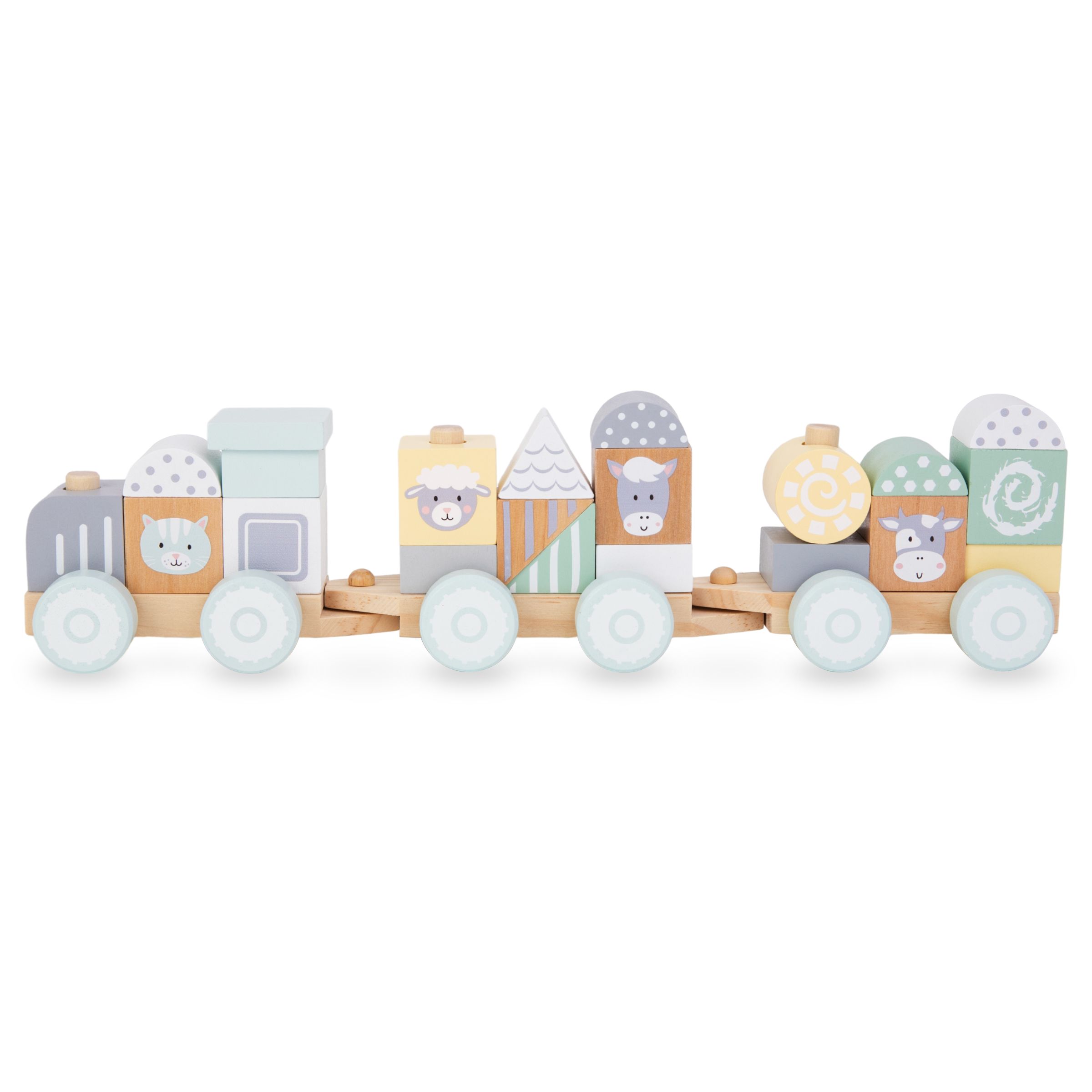 Vagoanele din lemn, echipate cu roți, pot fi îmbinate pentru a crea o locomotivă unică. Prin suprapunerea blocurilor colorate pe cuiele speciale, copilul mic construiește o construcție unică de tren. Trenul poate arăta diferit de fiecare dată! Când totul este gata, este timpul pentru o plimbare. În timpul călătoriei, cel mic poate desprinde vagoanele sau schimba poziția blocurilor. Pentru a adăuga varietate jocului, setul include cărămizi cu imaginea unor animale de fermă simpatice .